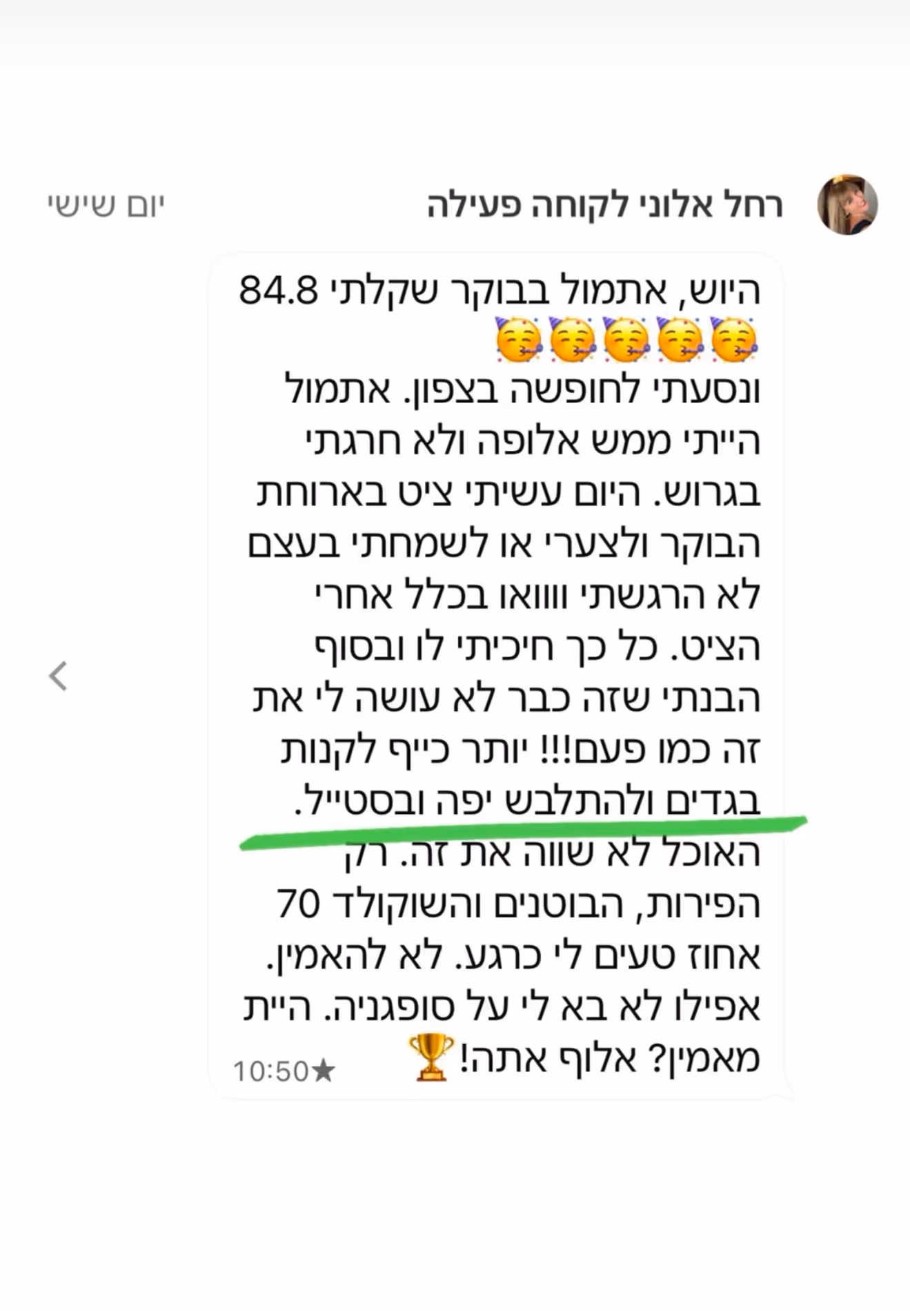 שכבר ניסתה דיאטות, אימונים, ותפריטים והגיעה ל80% ואז נתקעה