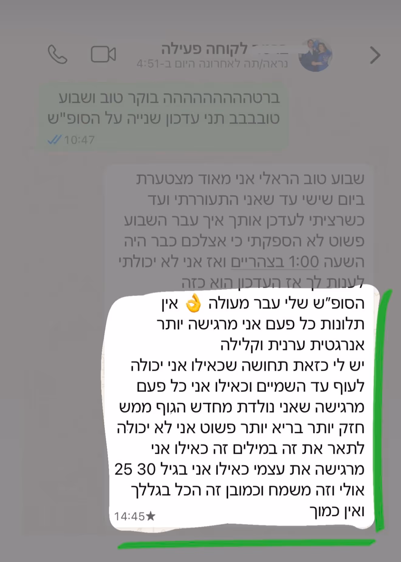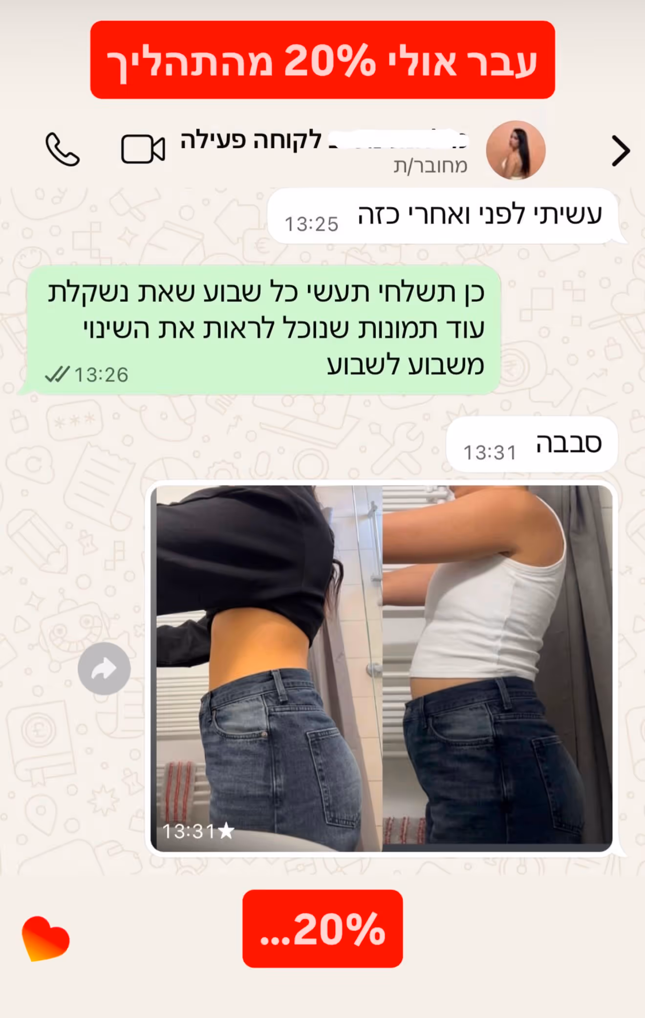 במהלך התוכנית, יש לך ליווי אישי בווטסאפ, ראשון עד שישי, ברוב שעות היום.